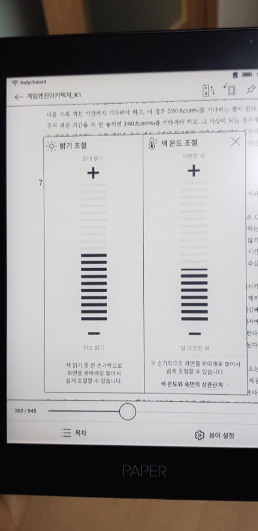 전자 잉크와 이런 색감 조절이 눈에 피로함을 줄여주는 거 때문에 전자책을 구매하는 이유도 있을 거 같네요.