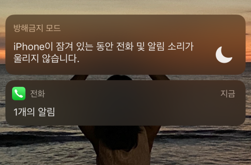 아이폰 방해금지 모드가 설정이 되면 전화 및 알림 소리가 울리지 않게 됩니다.