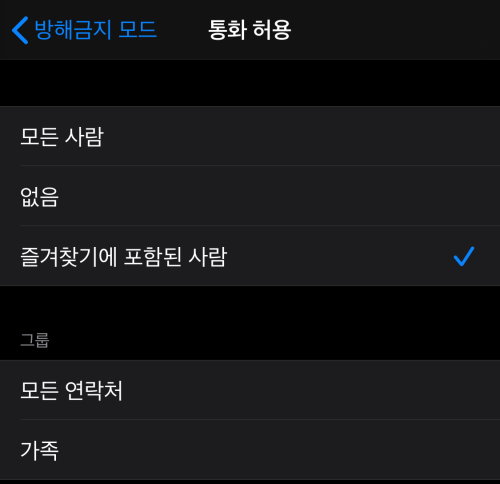 전화의 경우 모든 사람, 없음( 어떤 전화도 받지 않음), 즐겨찾기(연락처에서 설정)에 포함된 사람으로 지정할 수 있고, 연락처의 그룹으로도 지정 할 수 있습니다.