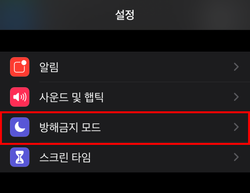 아이폰 설정앱에 들어가면 방해금지 모드탭이 있습니다. 눌러 줍니다.