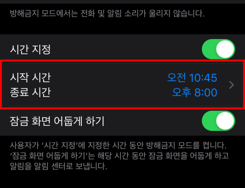 해당 시간을 설정해 두면 따로 on/off 없이 자동으로 방해금지 모드가 켜지게 됩니다.