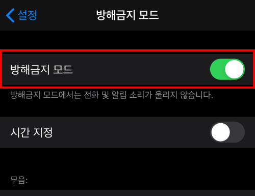 가장 상단에는 아이폰 방해금지 모드 설정을 할 수 있는 토글 버튼이 있습니다.
