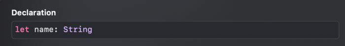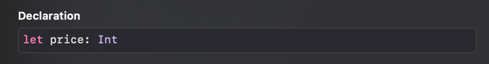 데이터형을 따로 적어주지 않더라도 price의 데이터 형은 Int, name의 데이터 형은 String이 들어 있는걸 볼 수 있습니다. 데이터 형이 어떻게 선언되었는 확인 하려면 'option' 키를 누르고 변수를 클릭하게 되면 Declaration 창을 이렇게 볼 수 있습니다.