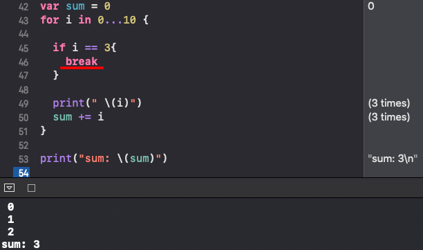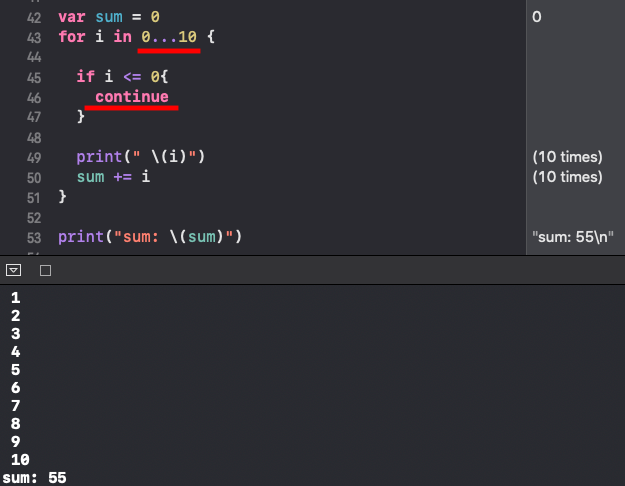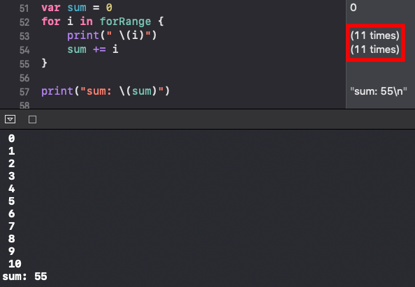 i 는 forRange(0... 10) 0 ~ 10까지의 범위의 값을 하나씩 받습니다. for 반복문 스코프 안에 내용을 보면 i 의 값을 출력하고 sum 변수에 더해 주고 있습니다. 반복을 할 때마다 범위의 값을 하나씩 받기 때문에 0, 1, 2 .... 10까지 출력이 되고 sum 변수에 출력한 값들이 모두 반복적으로 덧셈이 됩니다.