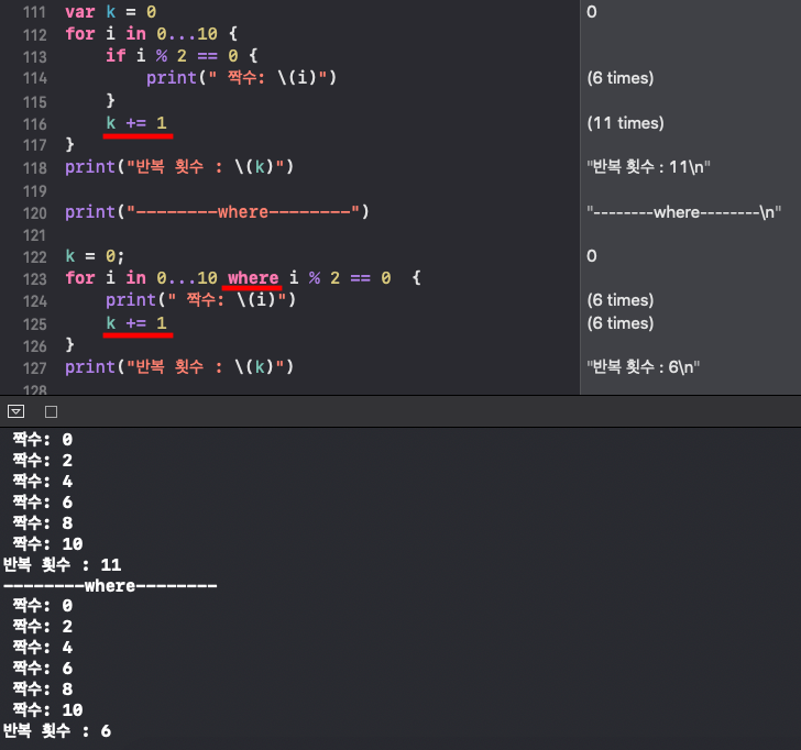 swift for 반복문에는 ' where ' 라는 것이 있습니다. 바로 if 조건문과 비슷합니다. 위에 코드를 보면 i를 2로 나눠서 나머지가 0이면 출력하는 코드를 만들었습니다. 출력결과를 보면 0, 2, 4, 6, 8, 10 짝수만 출력 된것을 볼 수 있습니다. where을 사용해서 똑같이 짝수만 출력 해보겠습니다. 똑같은 조건을 for 문 반복 범위 다음 where ( 조건 ) 을 작성하게 되면, 범위가 0 부터 10까지 총 11번 반복을 해야 하지만, where 조건에 맞는 짝수일 때만 반복문이 수행됩니다. 즉 (0, 2, 4, 6, 8, 10) 6번만 반복 하게 됩니다.