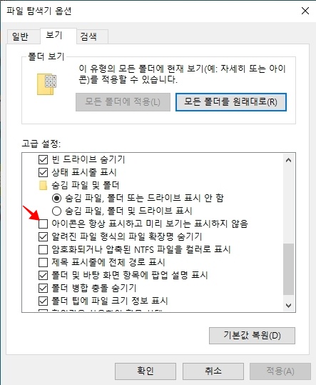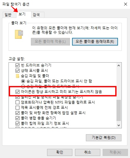 파일 탐색기 옵션에서 보기를 누른 후 아래 고급설정에 보면 아이콘은 항상 표시하고 미리 보기는 표시하지 않음이라는 부분을 보 실수 있습니다. 저는 현재 체크가 되어서 활성화가 되어있죠. 즉 미리보기 표시를 하지 않겠다고 되어있기 때문에 사진을 미리 볼 수가 없었던 거죠.