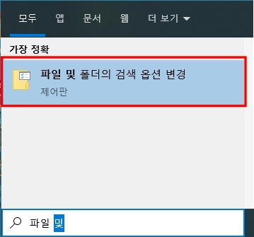 윈도우 키를 눌러서 파일 및 폴더의 검색 옵션 변경을 검색해 줍시다. 해당 방법 이외에 탐색기에서 보기를 누른 후 오른쪽 부분에 옵션을 클릭하면 같은 팝업창을 볼 수 있습니다.