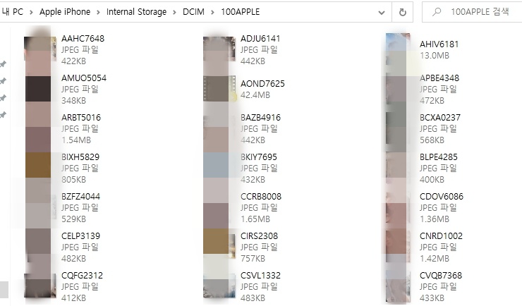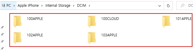 드라이브 안에 몇개의 폴더가 있습니다. 해당 폴더들에서 아이폰에 저장되어있는 사진과 동영상을 볼 수 있고, 손쉽게 복사를 통해서 사진을 컴퓨터로 옮길수 있습니다. 해당 드라이브는 쓰기가 금지되어있어서 아이폰 사진 폴더에 사진을 넣을수는 없습니다.