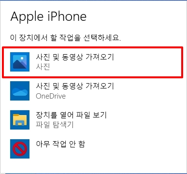 케이블을 이용한 아이폰 사진 컴퓨터로 옮기기 방식이 하나 더 있습니다. 사진앱을 이용하는 방법입니다. 아이폰과 컴퓨터를 케이블로 연결하면 장치와 연결되었다는 알림창이 나오게 됩니다. 해당알림창을 클릭하게 되면 이렇게 사진앱과 연결을 할지 묻는 팝업창이 나오게 됩니다. 여기서 사진 및 동영상 가져오기를 눌러줍니다.