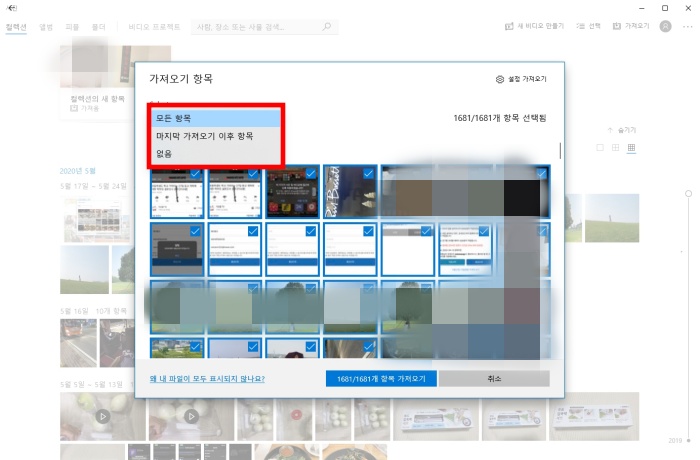 사진앱이 실행되면 아이폰의 사진을 가져올 수 있습니다. 모든항목을 선택하시면 아이폰의 모든 사진 및 동영상을 가져올 수 있게됩니다. 모든항목으로 계속 가져오게 되면 사진이 중복 저장이 됩니다. 따라서 마지막 가져오기 이후 항목을 사용하게 되면 이전에 가져온 사진을 제외한 사진을 저장할 수 있게 됩니다.