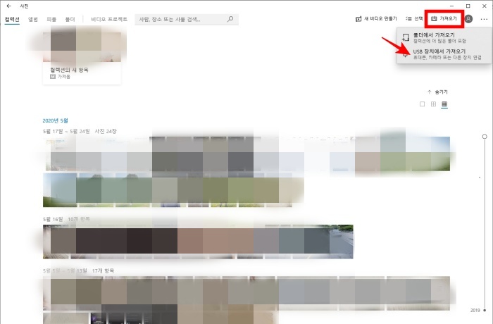 사진앱을 실행했을때에 가져오기 항목이 바로나오지 않을 경우에는 우측 상단에 가져오기를 누른 후 USB 장치에서 가져오기를 실행시켜 줍니다.