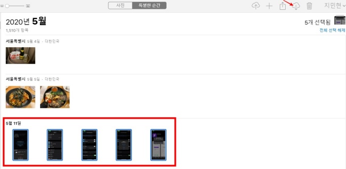 저장하고 싶은 사진을 선택해 줍니다. 선택을하게 되면 이렇게 사진에 파란색 테두리가 생기게 됩니다. 그리고 우측 상단에 보면 업로드, 다운로드, 삭제등 기능을 수행할 수 있는 버튼이 있습니다. 우리는 아이폰 사진을 컴퓨터로 옮기는 작업을 해야하기 때문에 다운로드를 받습니다. 화살표가 표시되어있는 버튼을 눌러 다운로드를 합시다.