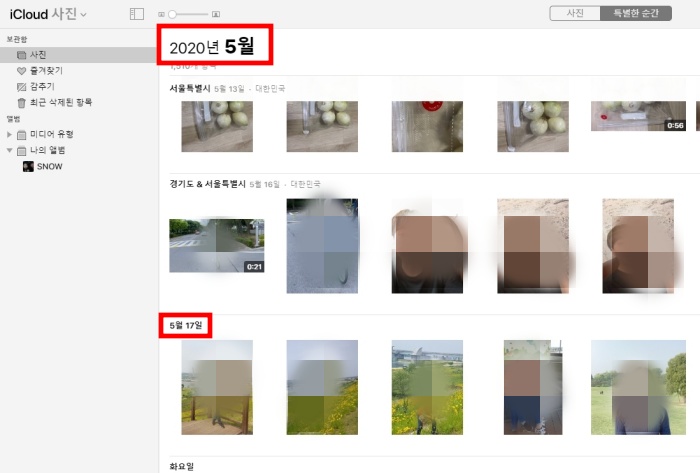 먼저 iCloud 사진에 접속합니다. 동기화가 되어있다면 좌측 사이드바에도 동일하게 보이게 됩니다. 방법은 간단합니다 내가 원하는 사진을 체크하여서 다운로드를 받으시면 됩니다. iCloud를 이용하면 내가 찍은 사진, 영상들을 날짜별로 정리되어 있는 걸 볼 수 있습니다. 만약 앨범에 따로 저장을 해놓으셨으면 좌측 사이드바에서 앨범들도 볼 수 있습니다. 저는 SNOW앨범이 하나 있네요.