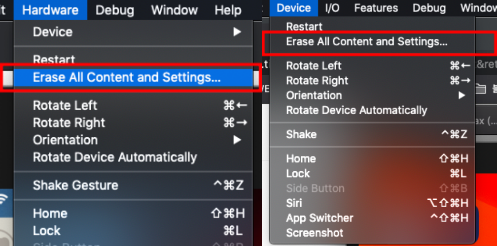 시뮬레이터의 메뉴중에 Hardward 혹은 Device를(버전에 따라서 다른 듯합니다.) 눌러주면 팝업 메뉴가 나오게 됩니다. 여기서 Erase All Content And Settings...을 눌러주게 되면 시뮬레이터의 모든 콘텐츠와 세팅들이 초기화되게 됩니다.