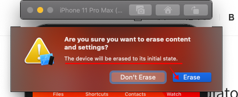 시뮬레이터 디바이스가 초기 상태로 삭제 된다고 한 번 더 알려줍니다. Erase를 눌러서 초기화 상태로 만들어 줍시다.