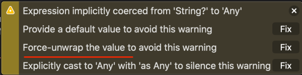 Optional 변수를 바로 사용할 경우 경고가 발생하는 걸 볼 수 있습니다. Fix의 방법으로 Force-unwrap이라는 부분이 있는데요. 이것이 강제로 부시는 방법입니다.
