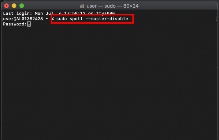 보안에 안좋을수도 있지만, 하나하나 허용하는게 여간 귀찮은게 아닙니다. 저는 터미널을 통해서 모두 허용을 해주었는데요. 먼저 터미널을 실행해줍니다. 그리고 sudo spctl --master-disable 을 입력합니다. 적용을 위해서는 mac을 재시작해주어야 합니다.