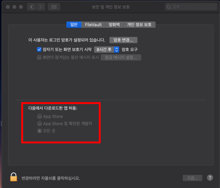 재시작하고 돌아왔습니다. 앞에 사진과는 다르게 모든 곳이라는 카테고리가 하나 추가가 되어있네요. 카탈리나 업데이트 이후 귀찮은게 많네요.