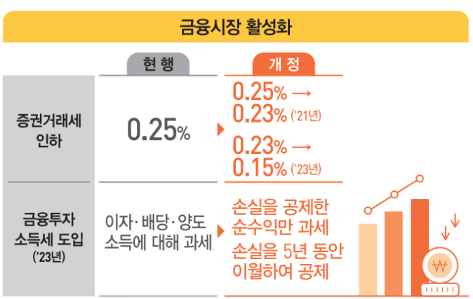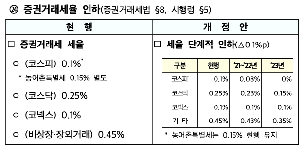 증권거래세 인하 부분도 개편이 되었는데요. 바로 내년부터 증권거래세를 내리기로 하였습니다. 당초 발표에서는 내 후년에 적용될 예정이었습니다. 1년 앞당겨 내년 0.02%, 2023년 추가로 0.08% 내려 총 0.1%가 인하된 0.15%가 적용 되게 되었습니다.