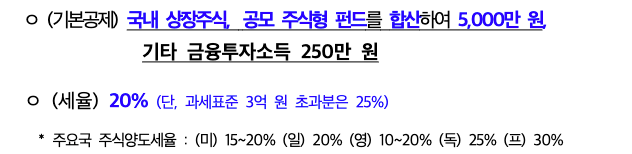 해외주식, 비사장 주식, 채권, 파생상품에 대한 기타 금융투자소득 기본 공제금은 250만 원으로 변경되지 않았습니다.