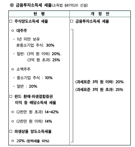 세율은 3억 원 이하 20%, 3억 원 초과분은 25%가 적용되었습니다. 기존에는 대주주 소액주주 등 세율이 나눠서 적용이 되었었는데요. 금융투자소득세 세율이 개정안에서는 공통 세율로 변경되었습니다. 주식으로 손해를 보고 펀드에서 수익을 냈을 경우 세금이 부관 되던 부분도 개정된 것입니다.