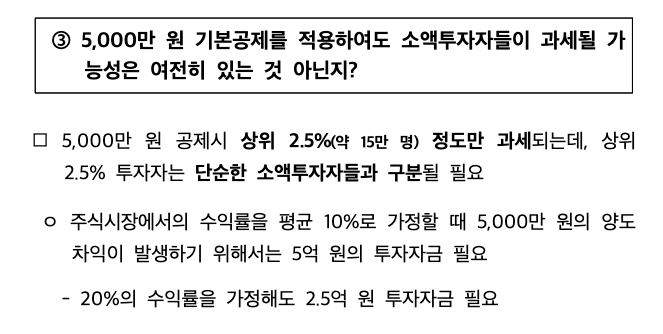 정부의 발표에 따르면 대부분의 주식투자자들은 현재와 같이 주식 양도차익에 대한 비과세 혜택을 누리면서도 증권거래세 부담이 줄어들게 된다고 설명했습니다. 5천만 원을 기본 공제 시 주식 투자자 상위 약 2.5% 15만 명 만이 주식 양도세를 부과하게 되어 세금을 내게 될 것이다.라는 정망인데요. 수익률 평균을 가정했기 때문에 정확한 수치라고 보기에는 어려울 거 같습니다.