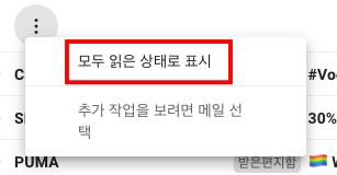 이제 다시 메일 리스트 좌측 상단의 ... 버튼을 눌러줍니다. 그러면 모두 읽음 상태로 표시 버튼이 나타나게 됩니다. 눌러서 원하는 지메일에서 전체 읽지 메일을 모두 읽음 상태로 만들어줬습니다.