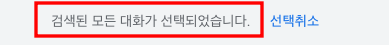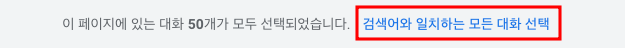 그러면 메일 리스트 상단에 페이지에 있는 대화 메일이 선택되었다는 메세지를 볼 수 있는데요. 저희는 50개가 아닌 전체를 원합니다. 옆에 있는 검색어와 일치하는 모든 대화 선택을 눌러줍니다.