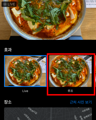 이제 아이폰 라이브포토를 gif 움짤 파일로 변환하는 방법을 알아보겠습니다. 먼저 라이브포토로 찍은 사진을 선택해 줍니다. 라이브로 찍은 사진은 좌상단에 LIVE 표시가 되어있습니다. 사진을 선택했으면 화살표가 표시된 방향인 위쪽 방향으로 스와이프 해줍니다. 그러면 라이브 포토 관련 인터페이스가 나오게 됩니다.