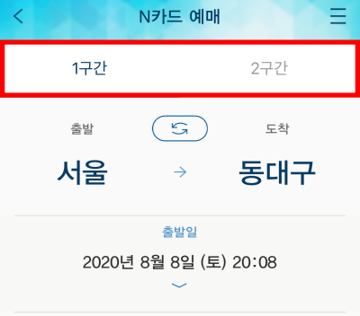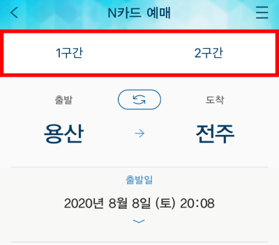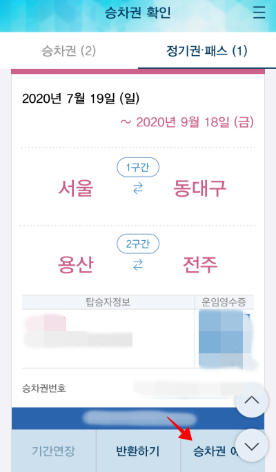 2인용의 경우 이용구간은 2개입니다. 승차권 예매 시 1구간, 2구간으로 나눠져서 탭이 생기게 됩니다. 용산 - 전주, 서울 - 동대구로 구매했습니다.