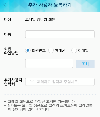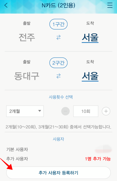 2인용 N카드 구매 시에는 같이 사용할 추가 사용자를 등록해야 합니다.