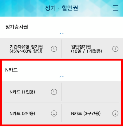 코레일 N카드는 정기 할인권 메뉴에서 구매할 수 있습니다.