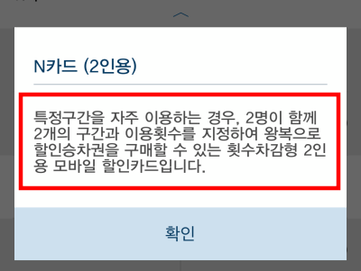 N카드는 1인용, 2인용, 3구간용으로 나눠져 있습니다. 차이점은 이용 횟수와 이용구간입니다.