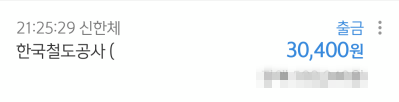 N카드 구매 비용을 캡쳐하지 않아서 통장 내역을 살펴보았습니다. 30,400원을 N카드 비용으로 사용했었네요. (1구간의 경우 더 저렴합니다. 동대구 - 서울 구간으로 했을 시에 21,700원입니다.) 그럼 할인은 얼마나 받았을까요? 총 8개의 승차권을 모두 40% 할인을 받았는데요.