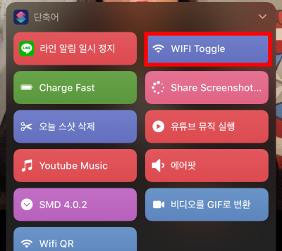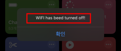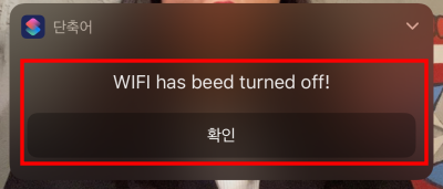 위젯에서도 아이폰 단축어 와이파이 토글이 잘 실행되네요. turned off! 똑같이 잘 뜨네요.