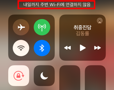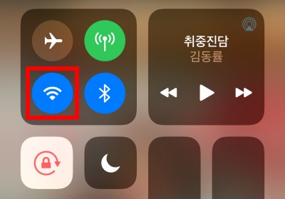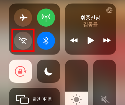 이제 와이파이를 확실히 꺼봅시다. 와이파이 토글 버튼을 눌러서 해제했습니다. 제어센터에는 어떻게 표시가 될까요?