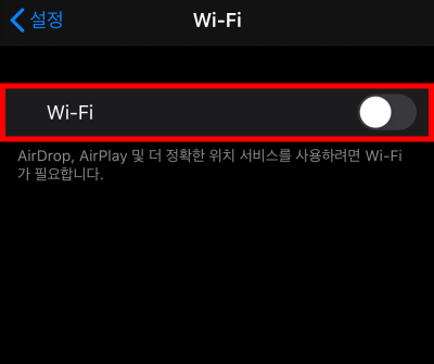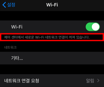 아이폰 설정창에 들어와 와이파이를 확인해 보면 여전히 토근 버튼이 켜져 있는 걸 볼 수 있습니다. 설명에는 제어센터에서 꺼져있다고 표시가 되어있네요.