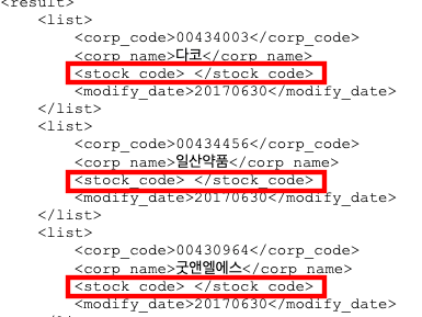 먼저 xml의 데이터를 읽어와서 stock_code 유뮤를 체크하여서 저장하였습니다.