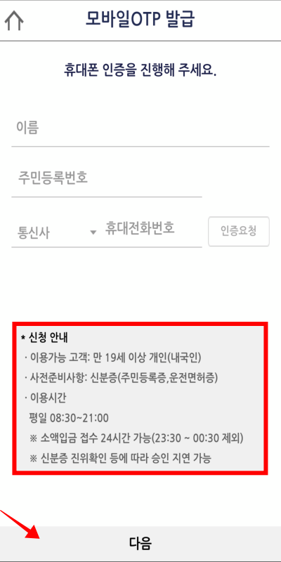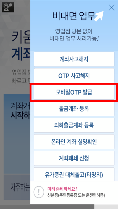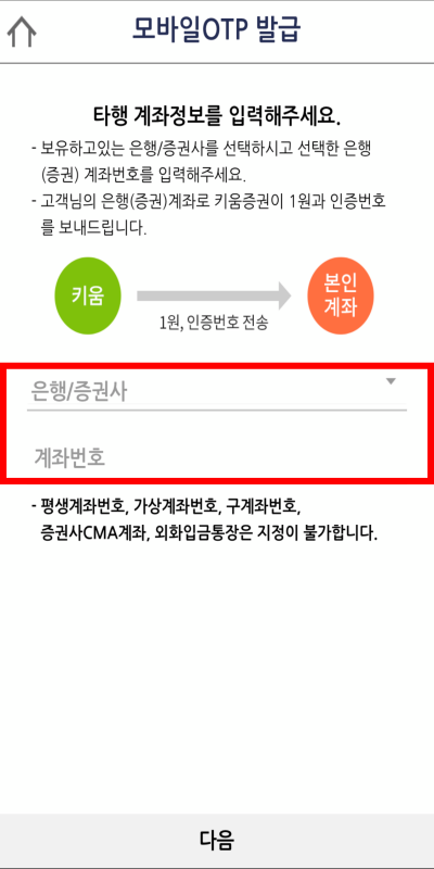 모바일 OTP 발급에 필요한 부분입니다. 키움증권 계좌개설과 동일합니다. 신분증과 인증을 위한 계좌가 필요합니다.