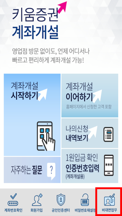 키움계좌개설앱입니다. 계좌만 개설하고 사용하지 않을 거 같아 지워버렸는데, 다시 설치를 했네요. 모바일 OTP 발급은 하단 아래에 비대면 업무 메뉴에 있습니다.