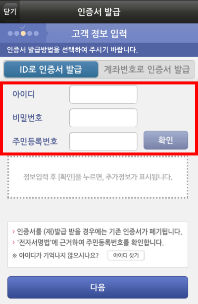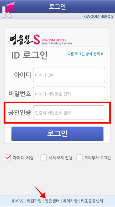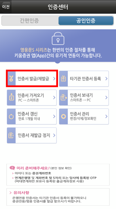 키움증권 계좌를 개설하고 난 후 영웅문S 이용을 위위 공인인증이 필요했습니다. 인증센터로 이동하여서 공인인증서 발급 신청을 하였습니다.