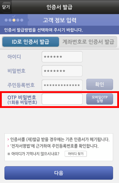 한 번에 쉽게 되는게 없습니다. 주민등록번호만 있으면 될 줄 았았지만 OTP 비밀번호라는게 또 필요하게 되었습니다. 여기서 느낀점은 그냥 PC로 진행했으면 덜 수고스러웠을 거 같다입니다. (컴퓨터로 진행을 해보지 않아서 확실하지는 않습니다... 키움증권의 영웅문S를 이용하려면 스텝이 굉장히 많은 느낌이네요.)