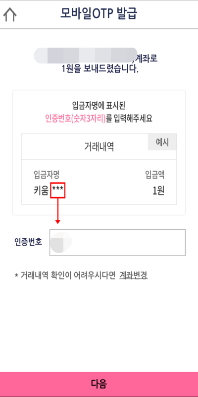 입력한 계좌에 입금된 내역을 확인하여서 인증번호를 입력해줍니다.