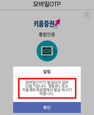 실행을 해보니 모바일OTP가 발급되지 않은 단말기라고 나옵니다. 키움계좌개설앱에서 발급을 하려고 알려주네요. 다시 키움계좌개설앱으로 이동해봅시다.