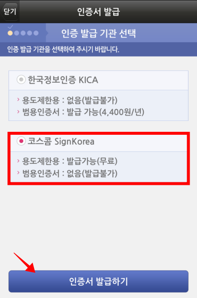 기존에 사용하는 은행 공인인증서가 아니기 때문에 새로 발급이 필요했습니다. 코스콤 SignKorea를 체크 후 인증서 발급하기를 해줍니다.