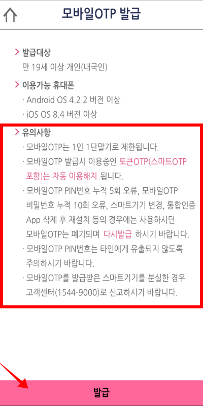 유의사항입니다. 모바일OTP는 1인 1단말기로 제한됩니다. 모바일 OTP 발급시 이용중이 토큰 OTP는 자동 해지됩니다. 인증번호 오류시 자동폐기되며 이후 다시발급을 받아야합니다.