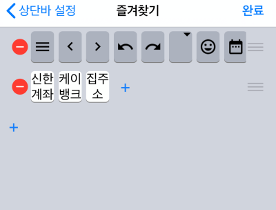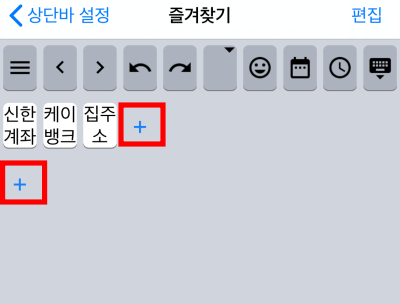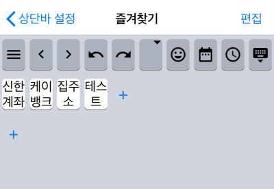 즐겨찾기 편집부분입니다. 이부분이 상단바에 노출이 됩니다. 라인별로 스와이프시 표시가 됩니다. 혹은 앞에 사진처럼 상단바 부분을 위로 늘리게 되면 키보드 영역이 커지는 걸 볼 수 있습니다.