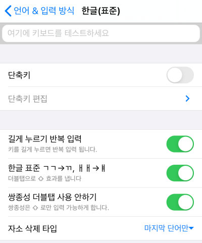 저는 영어키보드의 경우 모든 기능을 비활성화 해두었습니다. 자동 대문자의 경우는 자동으로 영어의 첫글자는 대문자로 입력되도록 하는 입니다. 단축키와, 길게 누르기 반복입력의 경우 한글입력 설정에서 설명하겠습니다.