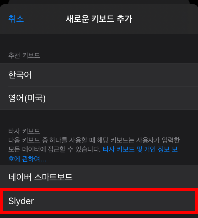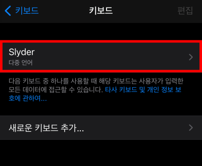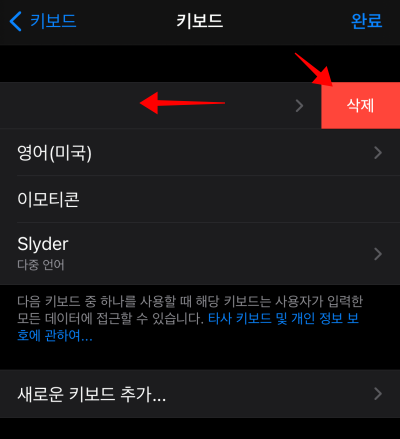 그러면 타사키보드 부분에 Slyder이 있습니다. 클릭해줍니다. 그리고 나서 기존에 설정된 키보드를 지워주면 되는데요. 살짝 밀면 삭제 버튼이 나옵니다. Slyder를 제외하고 모두 지워줍니다.