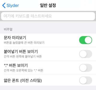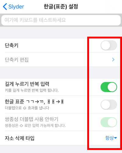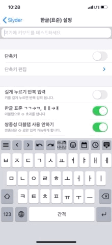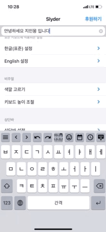 저는 그냥 아이폰 기본 키보드 처럼 자음 모음 분리가 되도록 항상으로 설정을 해두었습니다. Slyder 슬라이더 키보드를 사용하게 되면 입력한 텍스트를 삭제를 하고 싶을때 빠르게 할 수 있기 때문에 굳이 글자별 삭제가 필요없더라구요.